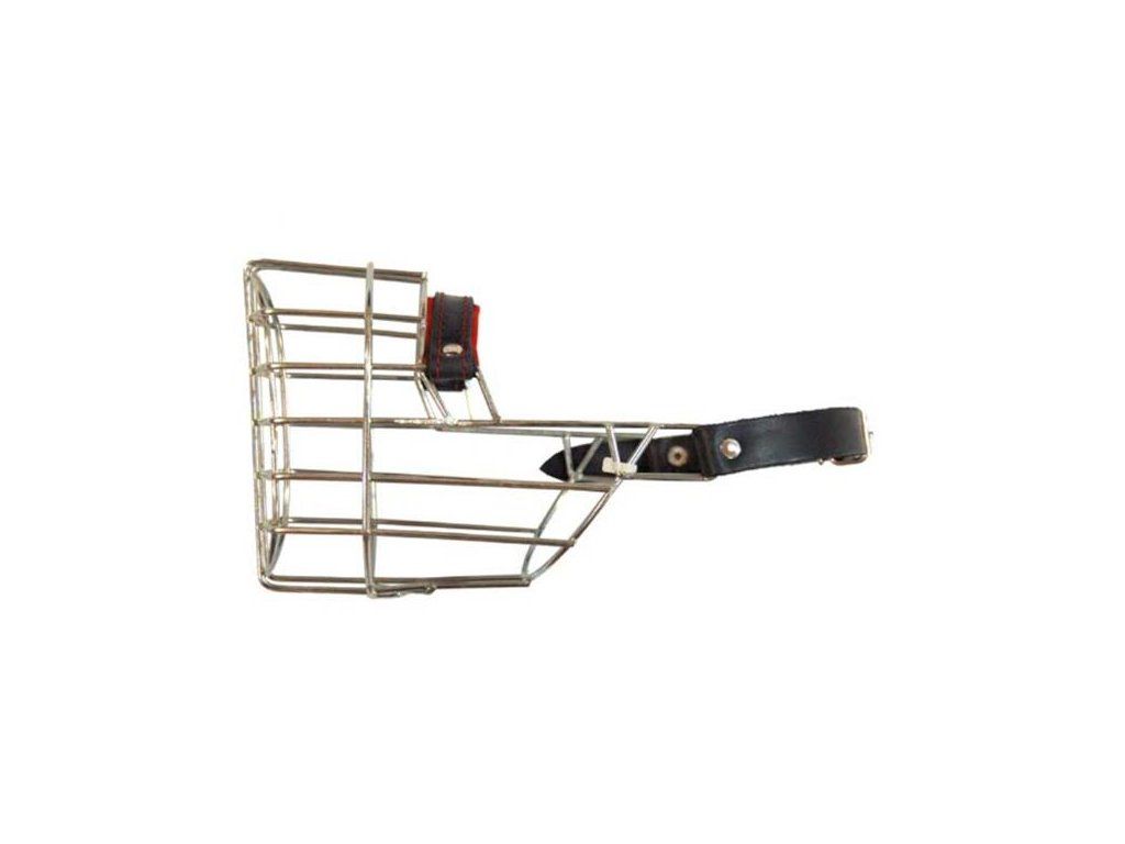 Kovový náhubek s koženými řemínky na zapínání. Vhodný zejména pro feny kokršpanělů a podobná plemena.