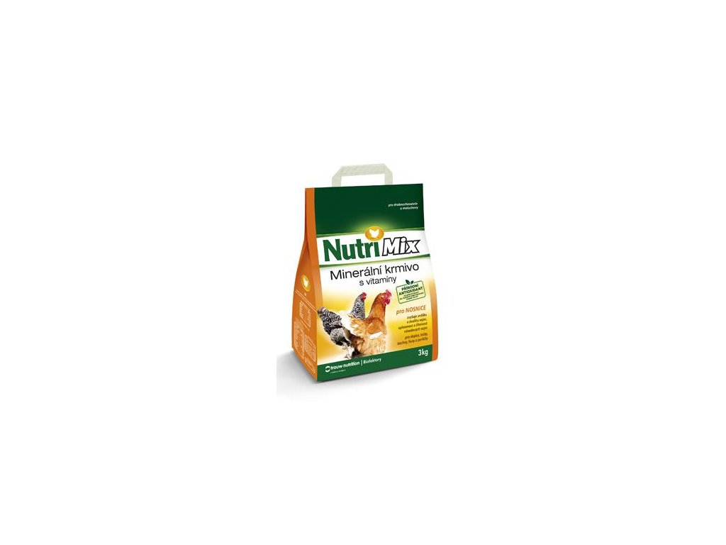 Minerální krmivo s vitaminy pro nosnice. Vitamino-minerální směs NUTRI MIX je určena pro drobnochovatele a malochovy. Přidává se do krmné dávky drůbeže, kterou tvoří převážně obilné šroty, kuchyňské zbytky a další domácí krmiva. Obsahuje biologicky účinné látky – vitamíny, minerální látky a aminokyseliny. Tato směs umožňuje chovatelům dokompletovat neplnohodnotnou krmnou dávku na potřebnou úroveň a zajistit tak zvýšení snášky, oplozenosti a líhnivosti vajec, zlepšení příjmu a využitelnosti krmiva a udržení dobrého zdravotního stavu drůbeže.